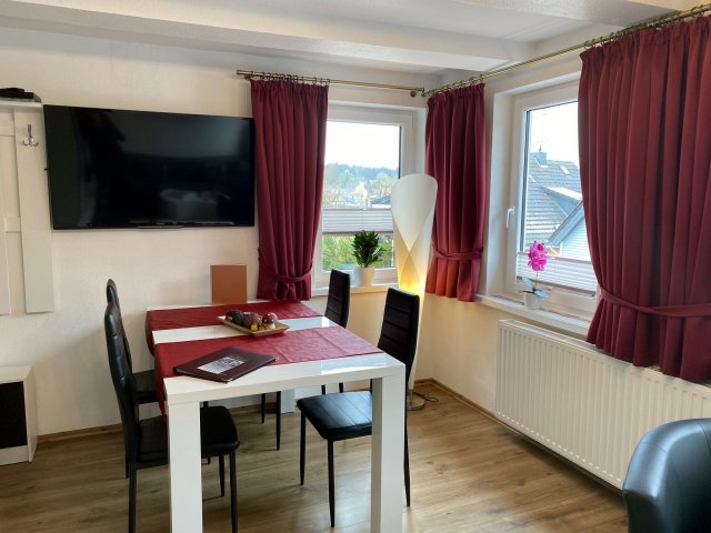 Unsere 2024 renovierte 63qm große (Bilder von 2024) 4 Sterne Ferienwohnung befindet sich in der 1.Etage, verfügt über ein Tageslicht-Bad mit Dusche/WC ; WLAN free und großer (55Zoll) Flachbildfernseher mit Kabel TV, Blue Ray Player, Couch, Sessel,Tisch, großer Esstisch mit Stühle, großer elektro Wandkamin; 2 Schlafzimmer- 1x mit Boxspringbett (2,00x1,80m) und Flach-TV, Kleiderschrank, 1x mit Doppelbett (2,00x180m), Kleiderschrank -jeweils Fliegengitter, alle Fenster komplett abdunkelbar; Kindersicherungen. KOMPLETT ausgestattete separate Küche mit Gefrierschrank, Kühlschrank, Geschirrspüler, Herd-(Ceranfeld,Backofen),Toaster, Mikrowelle, Kaffeemaschine, Pad-Maschine, elek. Kleingeräte, Töpfe und Pfannen, Geschirr, Besteck, Gläser... - Salz, Pfeffer. Spülmittel, Toi-Reiniger, einmalig Toi-Papier, Handseife, gr. Fön; Akku Staubsauger, gr.Balkon/Terrasse mit Sitzgruppe und Sonnenschirm, kostenfreier Parkplatz (pro Wohnung 1 Stellplatz), WLAN free, Supermarkt "Tante Enso"